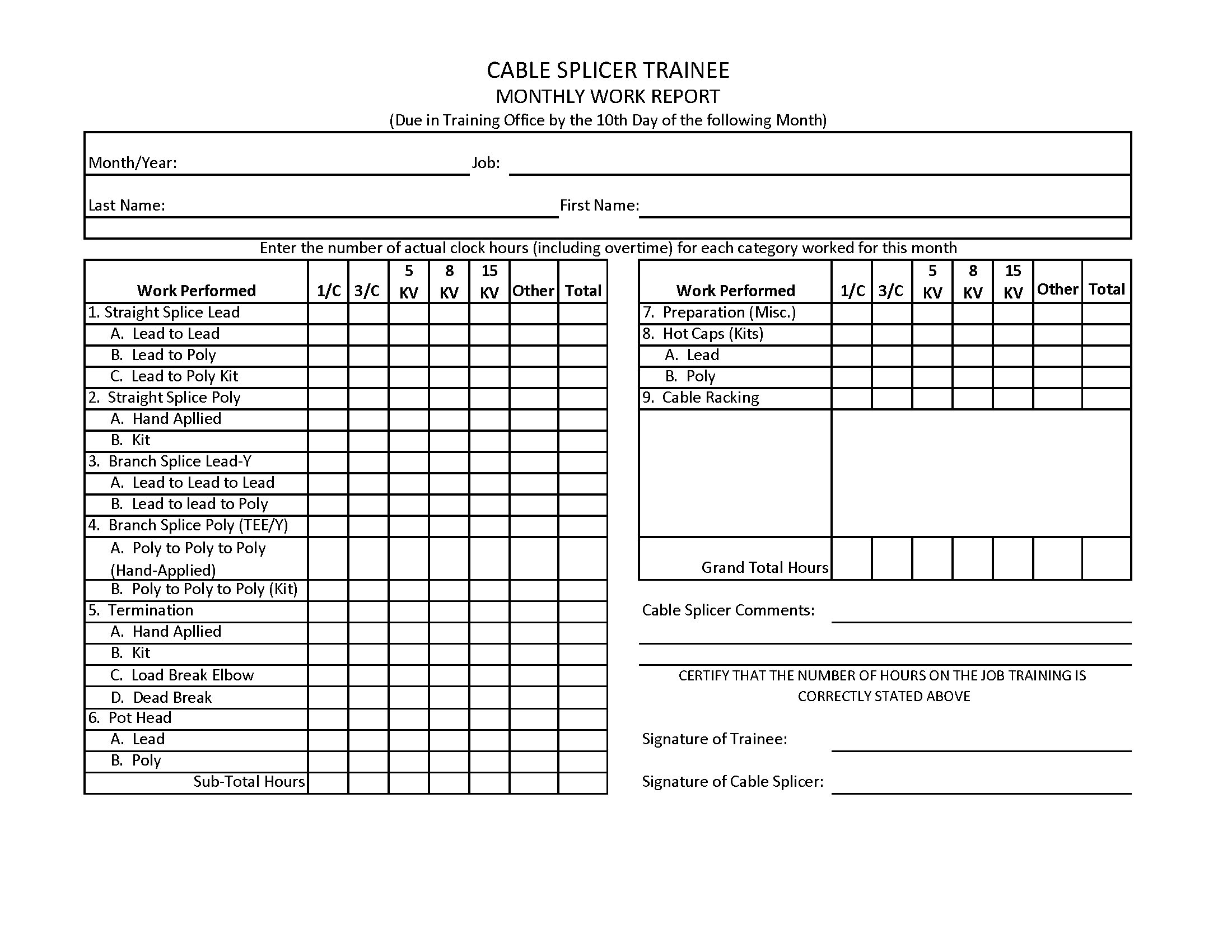 Monthly Work Hour Report is due by the 10th day of the following month. Email completed reports to Lainey Sanborn (lainey@hetf1186.org).